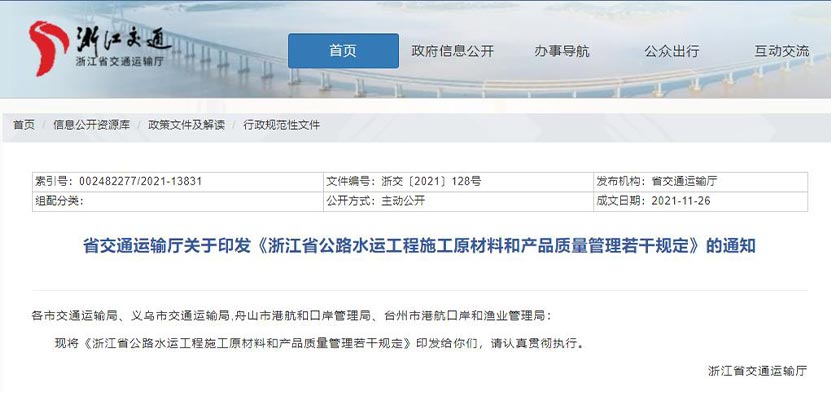近日,浙江省交通運輸廳制定出臺《浙江省公路水運工程施工原材料和產(chǎn)品質(zhì)量管理若干規(guī)定》(以下簡稱《若干規(guī)定》)。