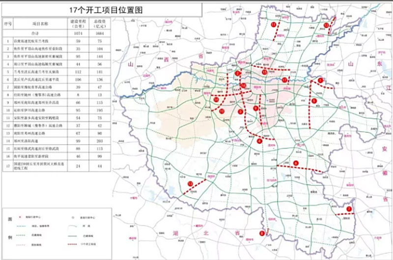 近日,河南省17個(gè)交通重點(diǎn)項(xiàng)目分別在鄭州、開(kāi)封、洛陽(yáng)等16個(gè)省轄市同步宣布開(kāi)工建設(shè)。開(kāi)工的17個(gè)項(xiàng)目包括16個(gè)、共1050公里的高速公路,總投資達(dá)1640億元。至此,河南省高速公路建設(shè)項(xiàng)目達(dá)到53個(gè),3390公里,總投資高達(dá)4556億元。